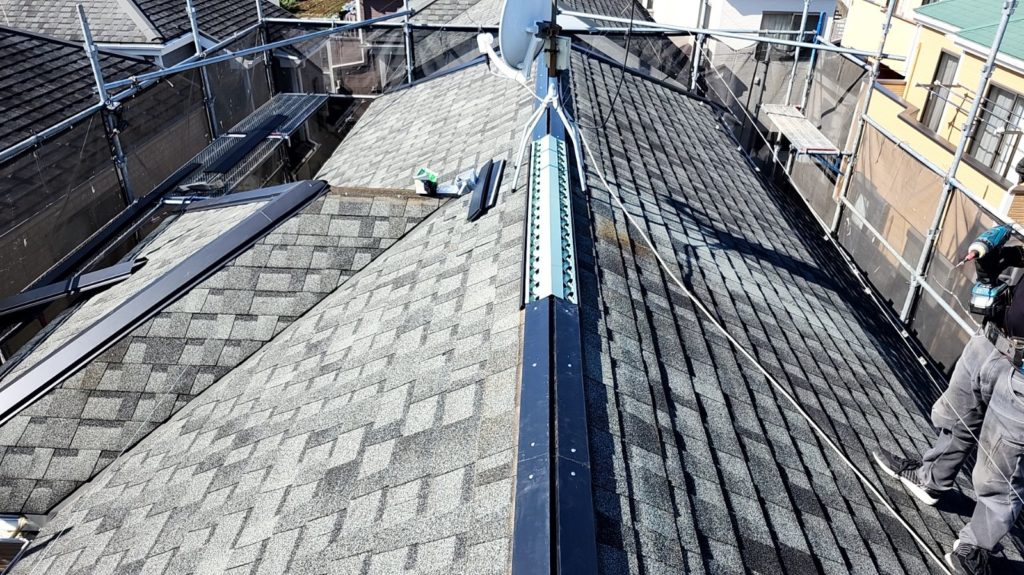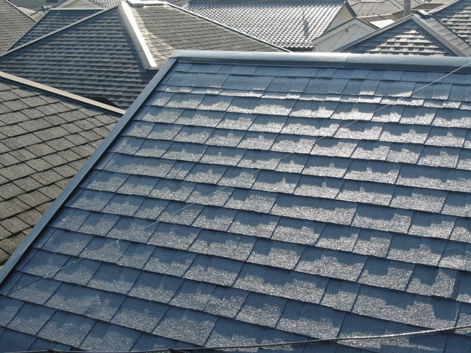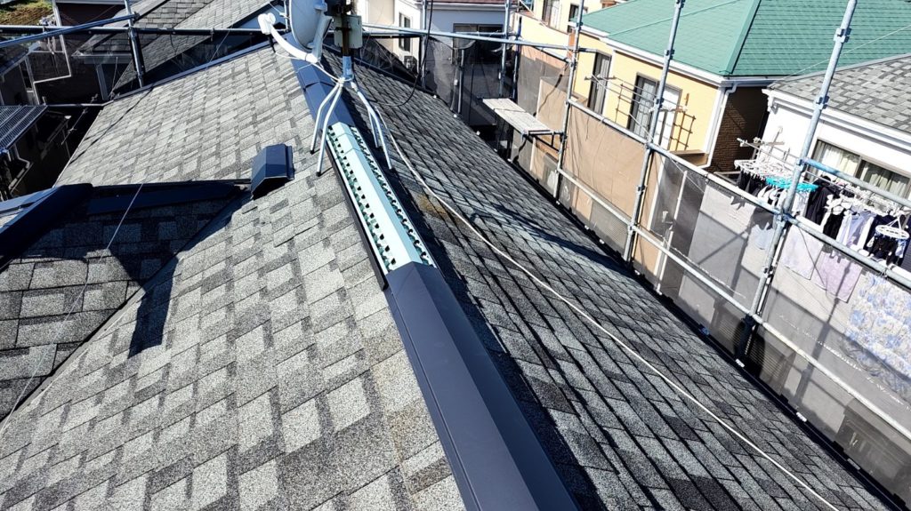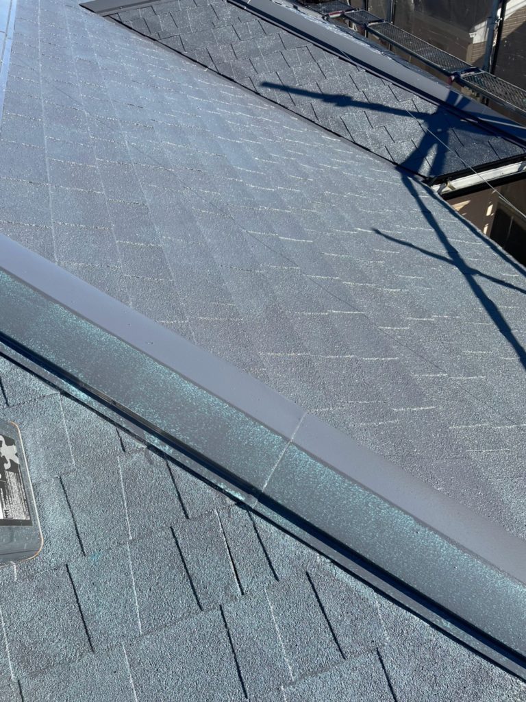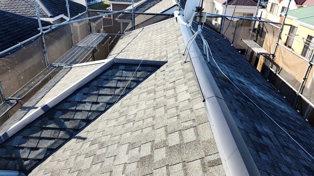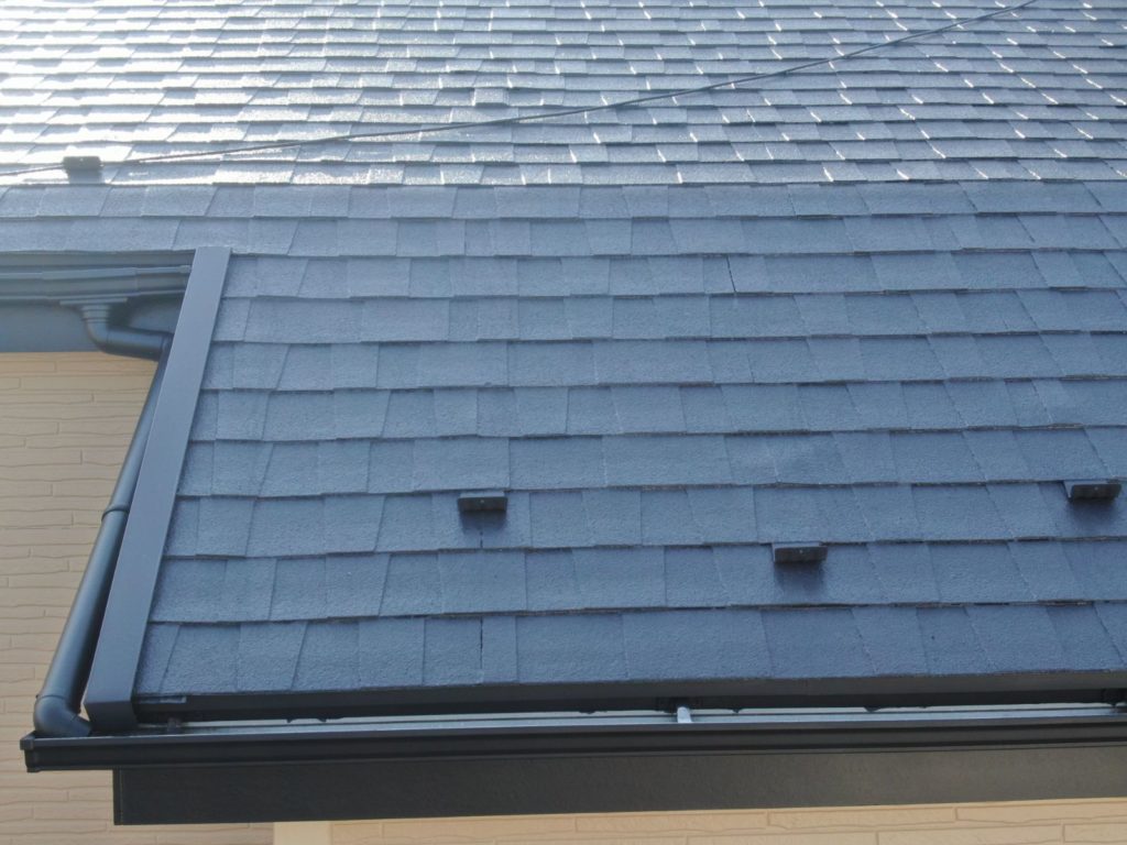 今回アスファルトシングルという屋根材でしたので、水性の屋根塗料を使用し、アスファルトシングルにはタスペーサーが使用できないので重なり部分をしっかり縁切り作業を行い、丁寧に施工いたしました。